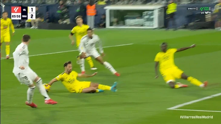 Фанаты «королевского» клуба нашли еще одну причину, почему «Мадриду» было тяжело: против них выступил главный судья Хесус Хиль Мансано. Федерико Вальверде простреливал в штрафную на набегающего Беллингема, Альфонсо Педраса постелился в подкате и мяч попал ему в руку.