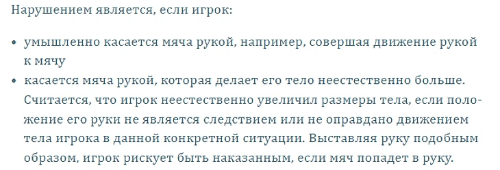 Несколько лет назад в правила прописали следующую формулировку: «Считается, что игрок неестественно увеличил размеры тела, если положение его руки не является следствием или не оправдано движением тела игрока в данной конкретной ситуации».