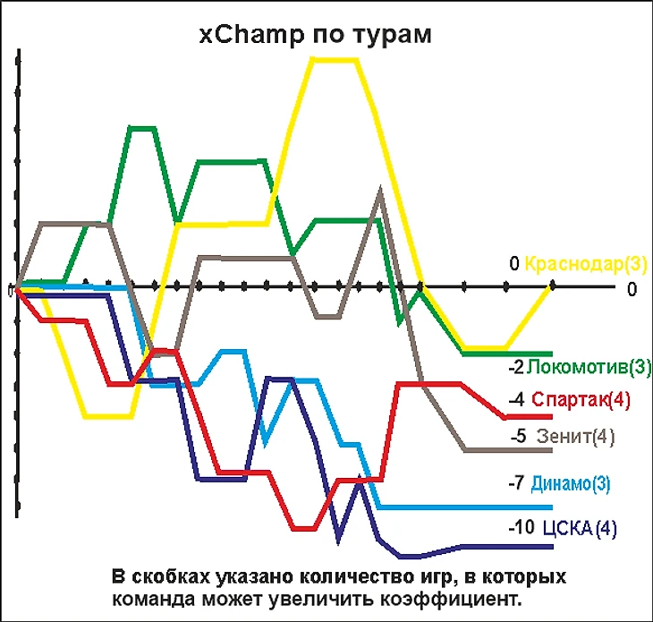 4. Коэффициент xChamp будет считаться из разности очков, реально, набранных в прошедших матчах и по нашему чемпионскому графику.