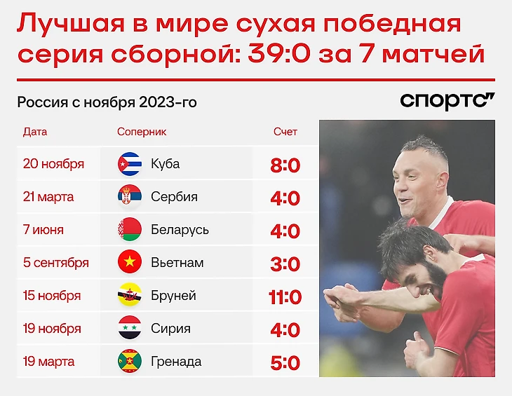 Это рекордная серия сухих побед в истории сборной России/СССР/Российской Империи – именно так на полном серьезе формулировала Opta еще прошлой осенью после Сирии. И действительно аналогов не найти.