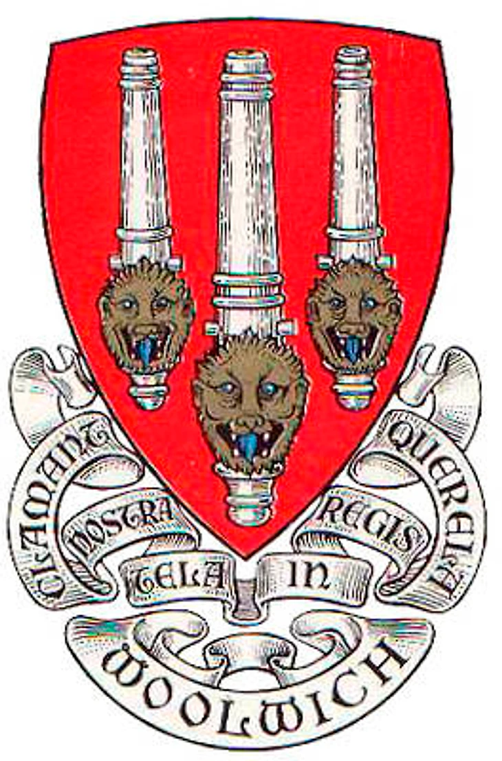 Эмблема была основана на гербе Вулвича, но отличалась наличием лавровых листьев и другим расположением текста в ленточках. На логотипе были изображены те же три пушки с головами львов и точно такой же латинский девиз: «CLAMANT NOSTRA TELA IN REGIS QUERELA».