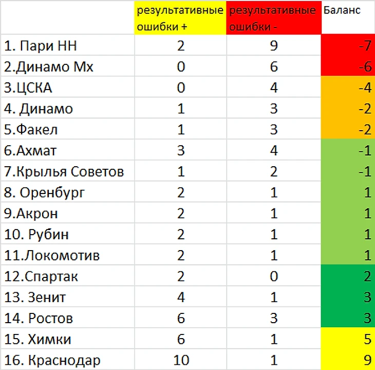 Следует сразу сказать - итоговые результаты по ошибкам сильно отличаются от реальных очковых приобретений /потерь даже в тех играх, где они допущены. Самый яркий пример - игра 1 тура, которую никто не смотрел: Химки - Динамо Мхч, где были назначены 2 ошибочных пенальти в пользу Химок. Они не были реализованы и итоговая ничья вполне себе закономерна по игре. Естественно, что и ошибки в пользу/против любой другой команды не всегда приводят к потере/приобретению очков. Вот и «любимому» судьями, согласно таблице, Краснодару не удаления за вторую ЖК Сперцяна ( с Факелом) и Косты (с Оренбургом) очковых приобретений не дали, как и засчитанный после «вне игры» гол с Акроном (итог - 4:0) и отмененный гол Ростова в 1 круге (2:0). Зато единственная ошибка против (пенальти с Химками) отняла победу. С «лидерами» таблицы все сложнее. Если Динамовцам Махачкалы откровенное удушение со стороны судей в начале турнира привело к потерям только с Пари НН, то нижегородцы уверенно вышли в лидеры этой таблицы после смены тренера и теряют очки из-за ошибок судей регулярно. Но там дело скорее в личной неприязни группы судей РПЛ (Мешков, Бобровский, Москалев) к персоне тренера Пари НН - как в случае «прессинга» Слуцкого судьями во времена работы того в Рубине.