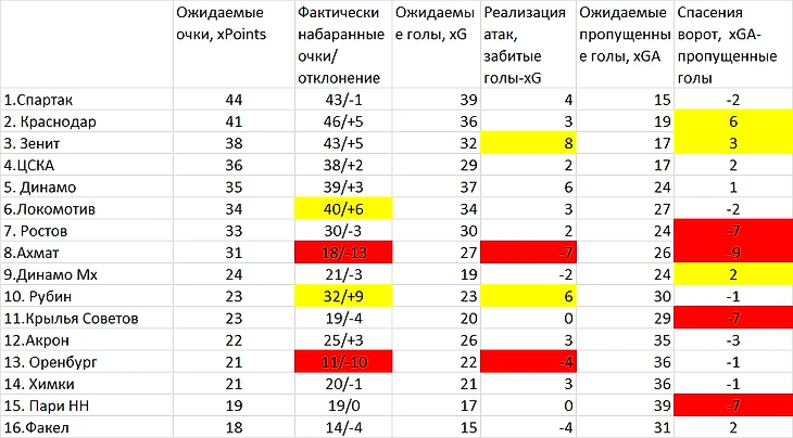 Во время перерыва на матчи сборных самое время разобраться, что же там получается по продвинутой статистике в РПЛ после 3 весенних туров. Вот какой вид имеет таблица по xPoints