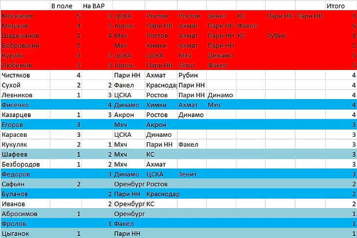 где «синим» выделены судьи, проведшие меньше половины игр сезона, «голубым» - тоже меньше половины, но получающие назначения сегодня, «красным» - худшие по ошибкам.