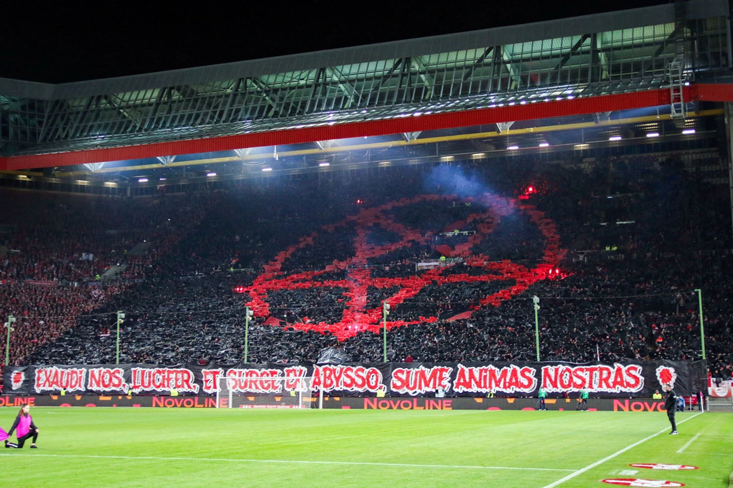 Давненько не было ничего из Германии, поэтому предлагаю переместиться именно туда, так как во 2-й немецкой Бундеслиге прямо во время матча «Кайзерслаутерн»—«Фортуна» во всю заворотную трибуну стадиона «Фриц Вальтер» появилась… пентаграмма! Огромный дьявольский символ был выложен на черном фоне и подожжен по вершинам звезды файерами, а подпись «Услышь нас, Люцифер, восстань из ада и забери наши души» на первый взгляд наводила легкий ужас на непосвященного зрителя.
