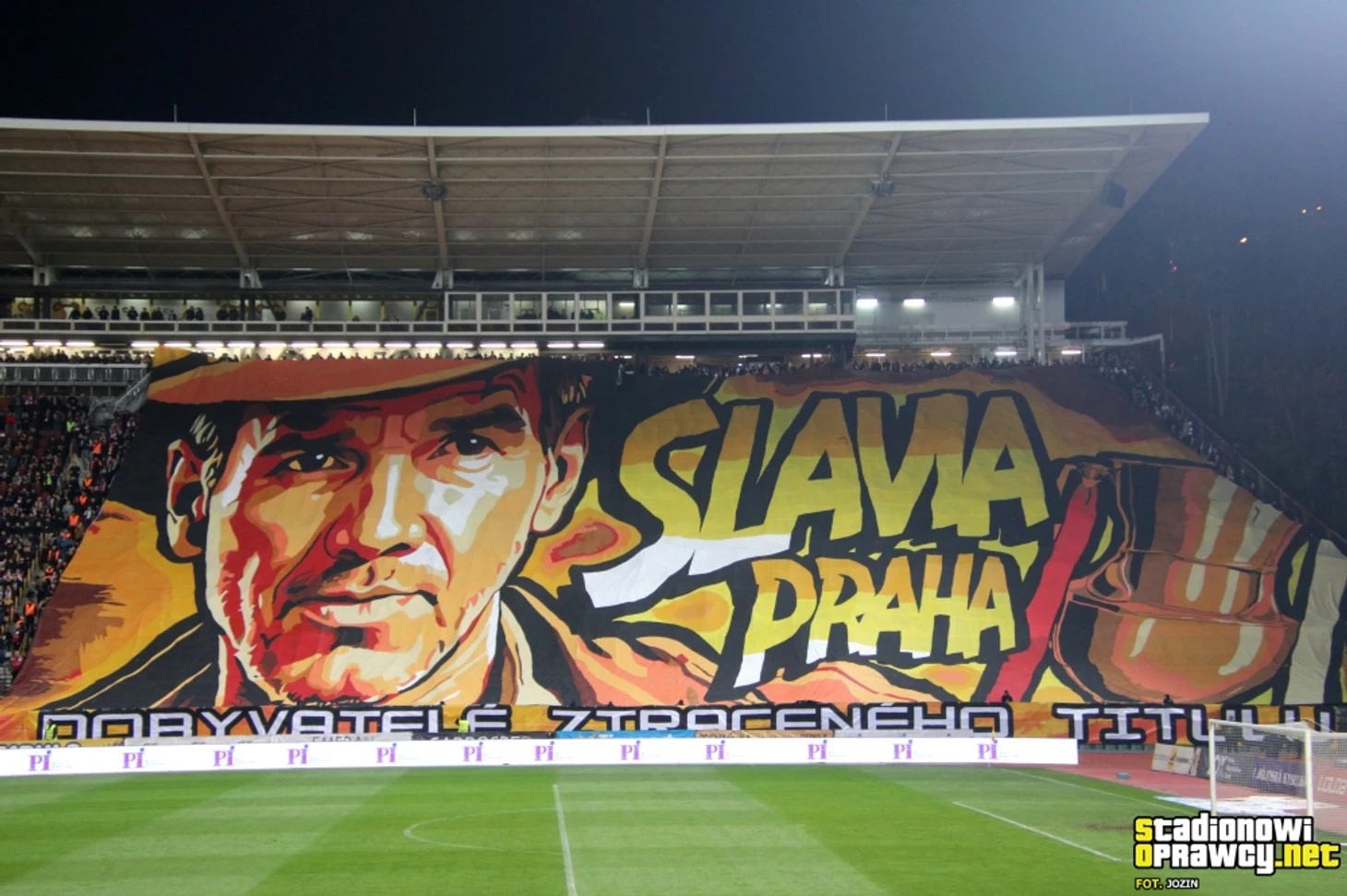 А так фэны красно-белых презентовали на этой игре парочку хорео, первым из которых был «Славия Прага. В поисках утерянного титула». Этим баннером ультрас уже начали готовиться к надвигающейся победе «Славии» в чемпионате Чехии, а про утерянный титул было сказано к тому, что их клуб не выигрывал первенство уже целых 3 года!