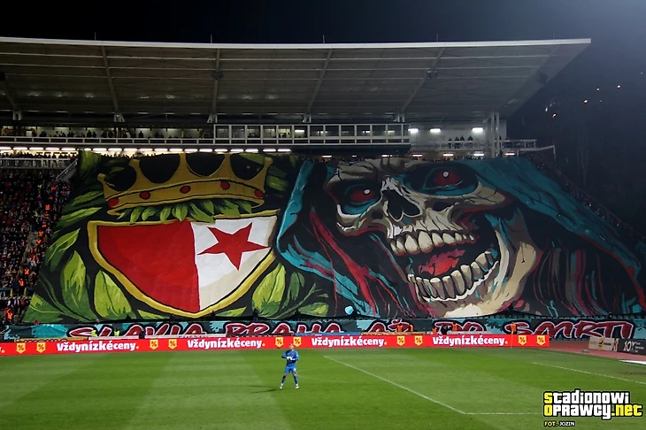 Про второй перфоманс пражан на этой игре сказать особенно нечего, так как его сюжет и смысл прост и понятен: изображение фанатского скелета в капюшоне соседствует с эмблемой клуба, а подпись «Славия Прага до самой смерти!» совершенно отчетливо говорит о том, что болельщики будут со своей команды всегда и до самого конца.