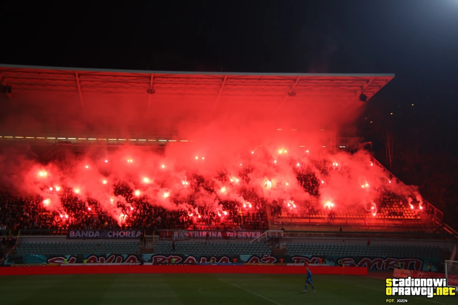 Остаемся в Кракове, чтобы заглянуть на матч другой местной команды, «Вислы», которая днем ранее принимала на своем поле «Котвицу» в рамках 1-й лиги Польши. Кибицы «Вислы» исторически находятся в состоянии жесточайшей войны с соседями из «Краковии», о леденящих душу подробностях которой я рассказывал в одном из прошлых выпусков. Но сегодня мы поговорим об их противостоянии не с той точки зрения кто, где, когда и кого зарезал и убил, а исключительно в рамках конкуренции двух трибун в уровне перфомансов.