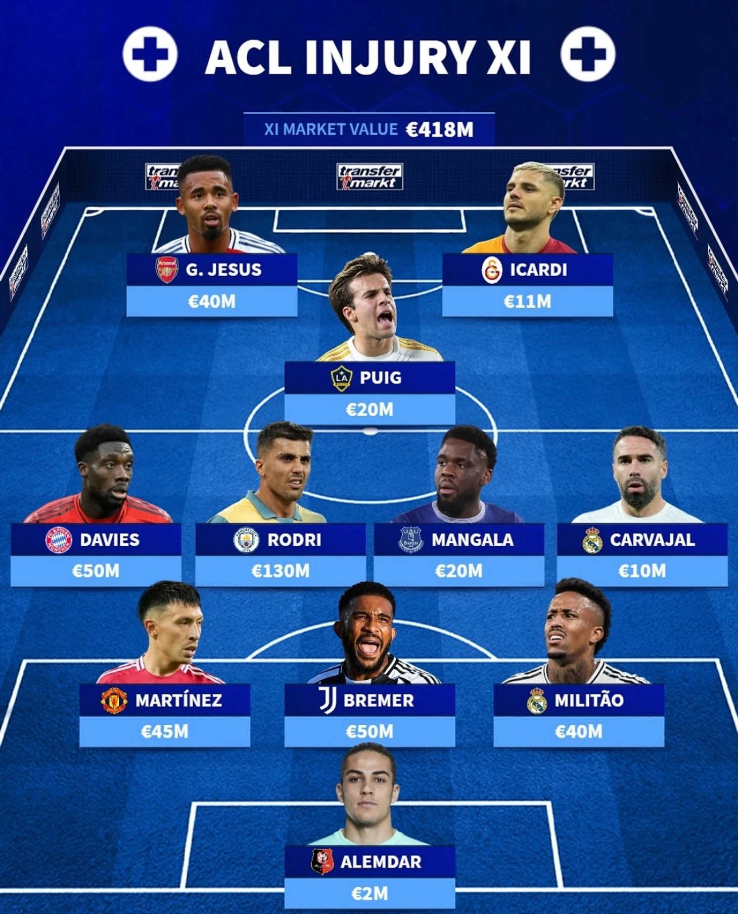 🤕 Из игроков с травмой «крестов» в этом сезоне можно собрать команду. Общая стоимость состава – 418 млн евро
