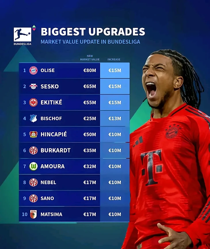 Майкл Олисе («Бавария») − с 65 млн евро до 80 млн евро (+15 млн);