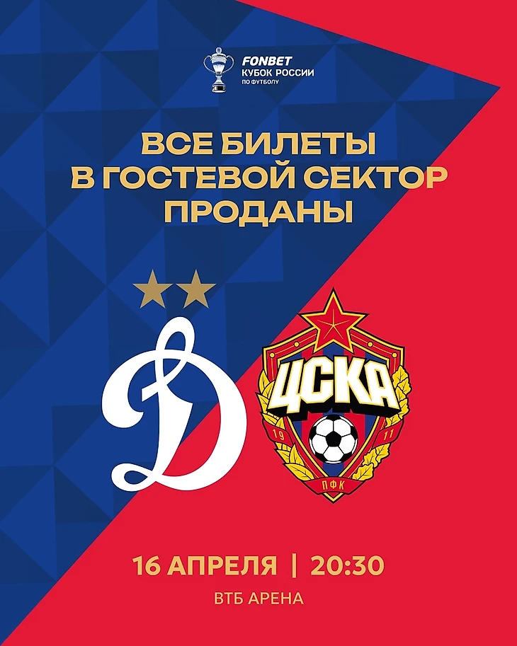️Все билеты в сектор армейских болельщиков на полуфинальный матч пути РПЛ FONBET Кубка России Динамо - ЦСКА проданы!