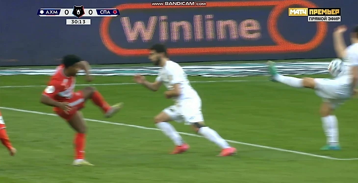 мяч после прострела Маркиньоса попадает сначала в бедро Садулаеву, а затем - в отставленную руку. Но Ахмат ведь не «тварь дрожащая», а «право имеет».