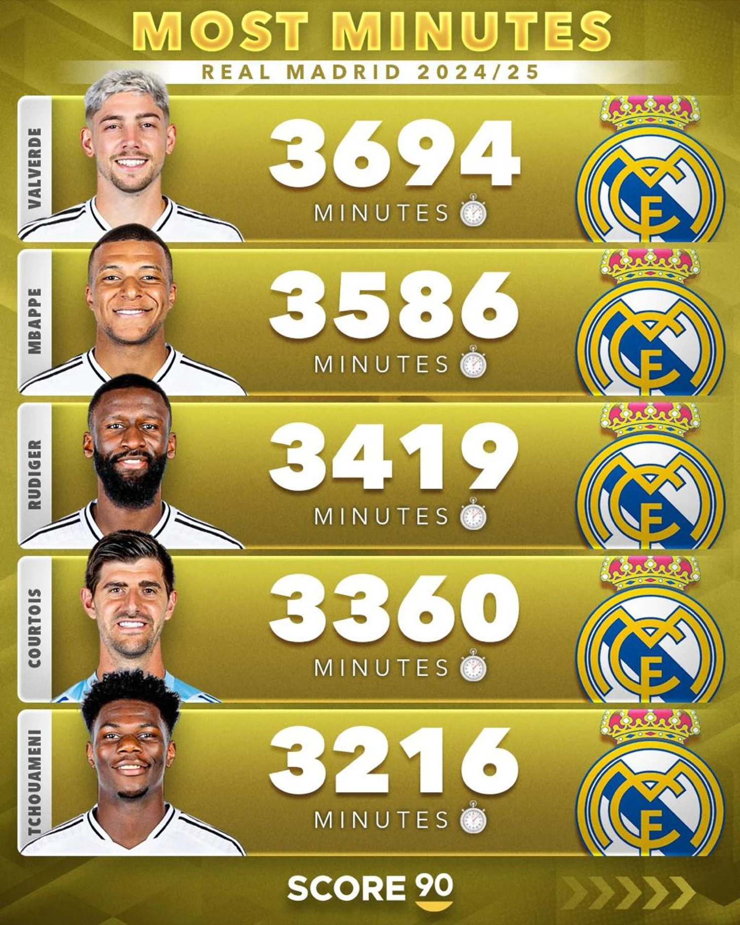 А как обстоят дела у «Реала»? Главный трудяга мадридцев – Феде Вальверде. Уругваец уже наиграл 3694 минуты, став самым используемым игроком «сливочных» в этом сезоне.
