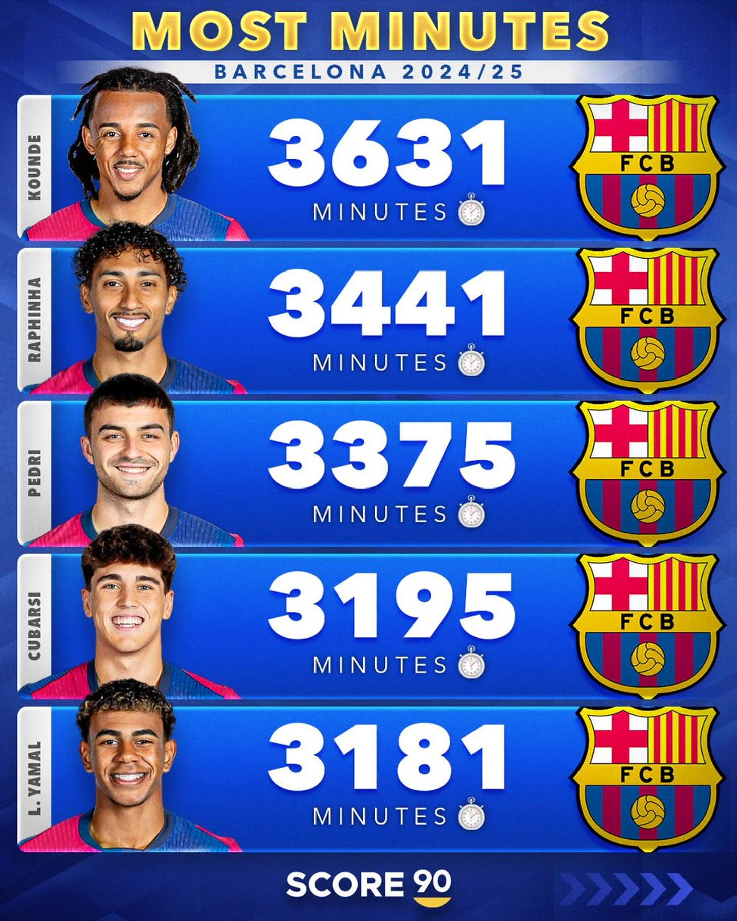В топ-5 каталонцев вошли Рафинья, Педри, Пау Кубарси и Ламин Ямаль, но настоящий «железный человек» – Жюль Кунде. Француз сыграл во всех 44 матчах «Барсы» в этом сезоне, набрав впечатляющие 3631 минуту.