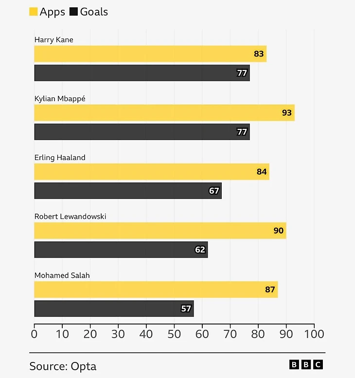 В пятерку лучших также попали Эрлинг Холанд (67 голов), Роберт Левандовски (62 гола) и Мо Салах (57 голов).