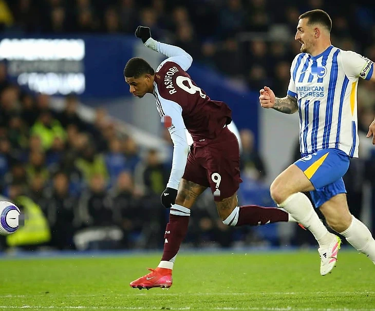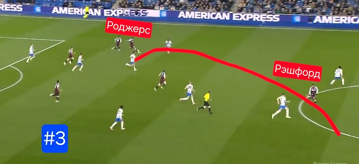 3. Контратака. Слишком много игроков Виллы оборонялось, поэтому через короткий пас выходить – значит тормозить нападение. Маркус располагается между центральными защитниками Брайтона на линии оффсайда. Роджерс посылает мяч ему на ход. Рэшфорд во время выскакивает, не попав в положение вне игры. Выходит на рандеву с Вербрюггеном и открывает счёт.