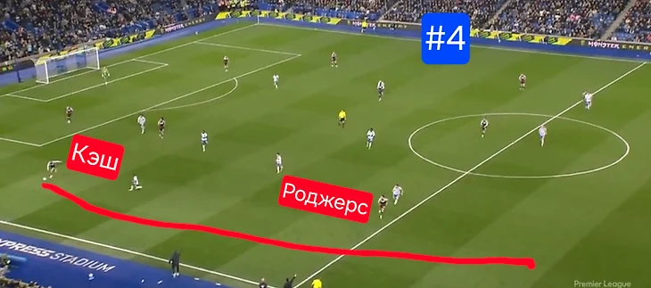 4. Морган Роджерс на гигантских скоростях с центра поля забегает на правый фланг. Правый защитник Мэтти Кэш видит это забегание и посылает мяч на Роджерса.