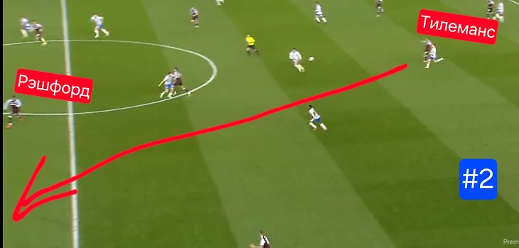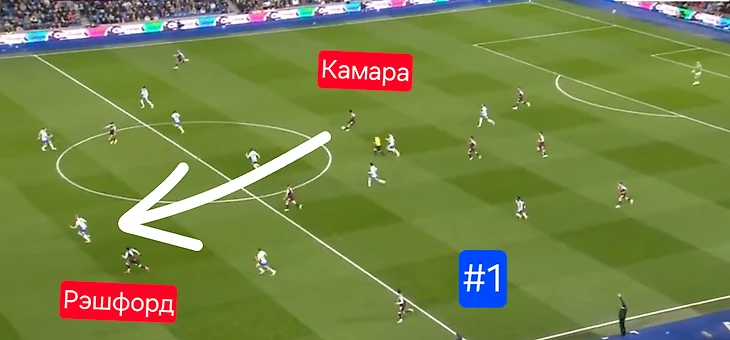 #1. Опорник Бубакар Камара опустился в сторону обороны, сбросив опеку. Параллельно в атаке Рэшфорд постоянно искал коридор между правым центральным защитником и правым крайним защитником. Когда он его наконец нашёл, Камара сразу же отдал длинную передачу на Маркуса.