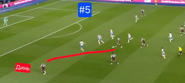 5. Брайтон часто оборонялся 5 в линию – 4 защитника + опорник. Но на данном скриншоте левый защитник Эступиньян вынужден присматривать за угрозой со своего фланга. А по центру сразу 3 бирмингемца напирают на 4 игроков Брайтона. Никому нет дела до левого защитника Люка Диня. Уоткинс стягивает на себя оборонцев и отдаёт передачу налево. Далее – кросс от француза.