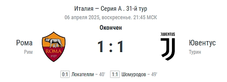 Завершился матч 31-го тура итальянской Серии А, в котором встречались «Рома» и туринский «Ювентус». Команды играли на стадионе «Олимпико» в Риме (Италия). Встречу обслуживала бригада арбитров во главе с Андреа Коломбо. Итоговый результат — 1:1.