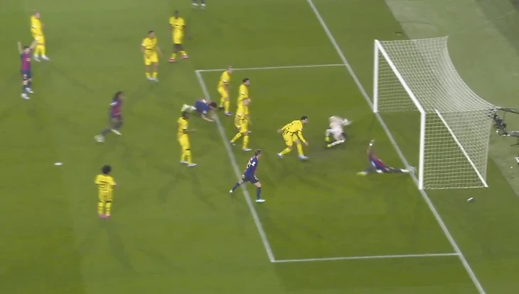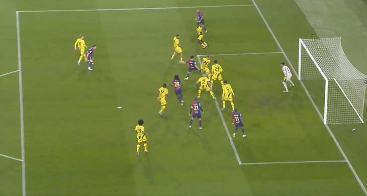 В самом начале второго тайма сработала атакующая мегатройка: Ламин Ямаль мягко забросил, Рафинья в полете выловил мяч почти на лицевой, спас от ухода, и четко направил пас вдоль линии.