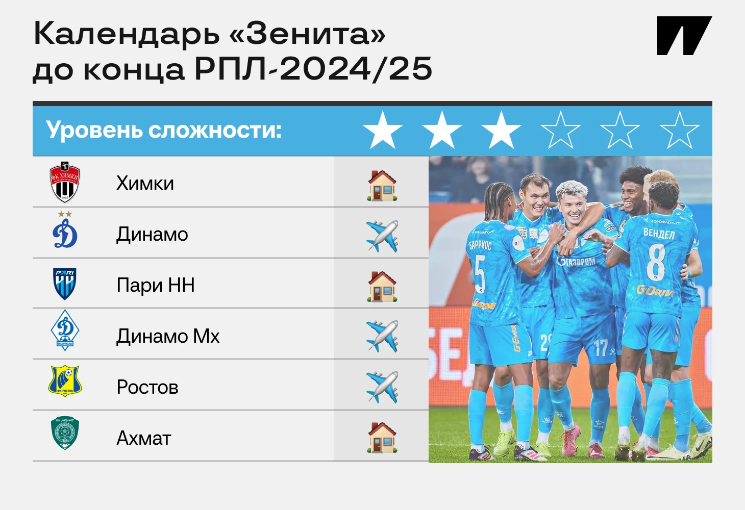 У «Зенита» приятное расписание. Всего один матч против команд из топ-6. Ликвидировать отставание от «Краснодара» можно уже после встречи с проблемными «Химками». Дальше «Динамо» с классическими при Марцеле Личке проблемами в обороне и буксующий «Пари НН».