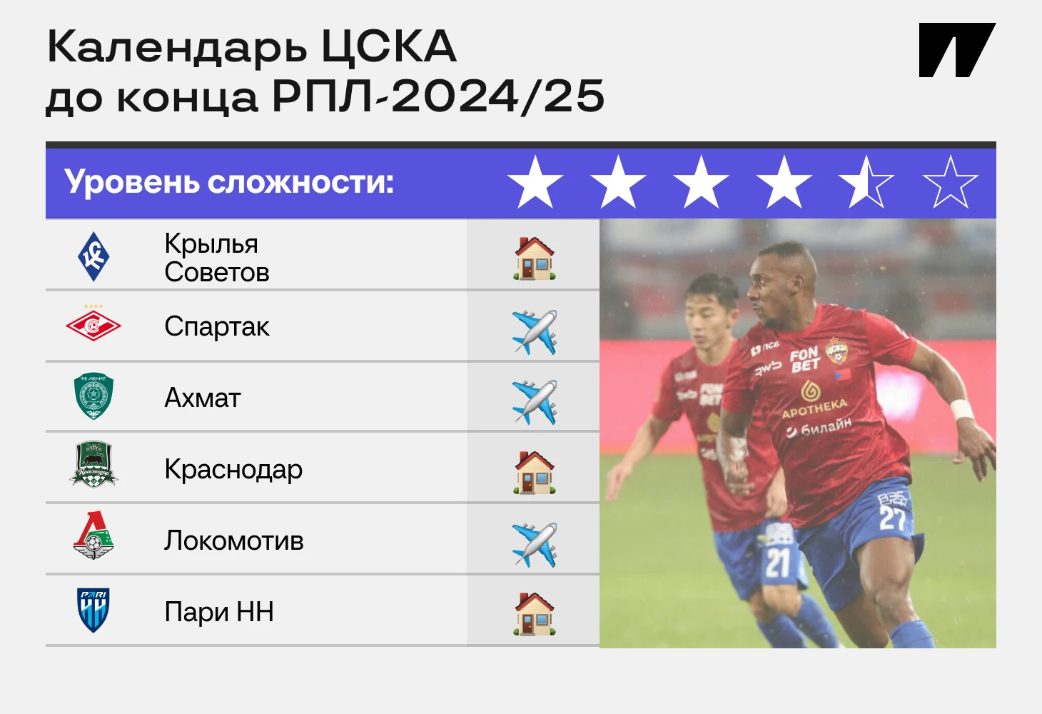 Для ЦСКА концовка чуть сложнее, чем спартаковская. Команда внезапно запрыгнула в гонку, хотя перед рестартом отставала от «Зенита» на восемь очков. Команда Марко Николича – лучшая по очкам весной (16), но не так много создает впереди (восьмое место по xG). В этом плане матчи с «Ахматом», «Краснодаром» и «Пари НН» – потенциальная проблема.