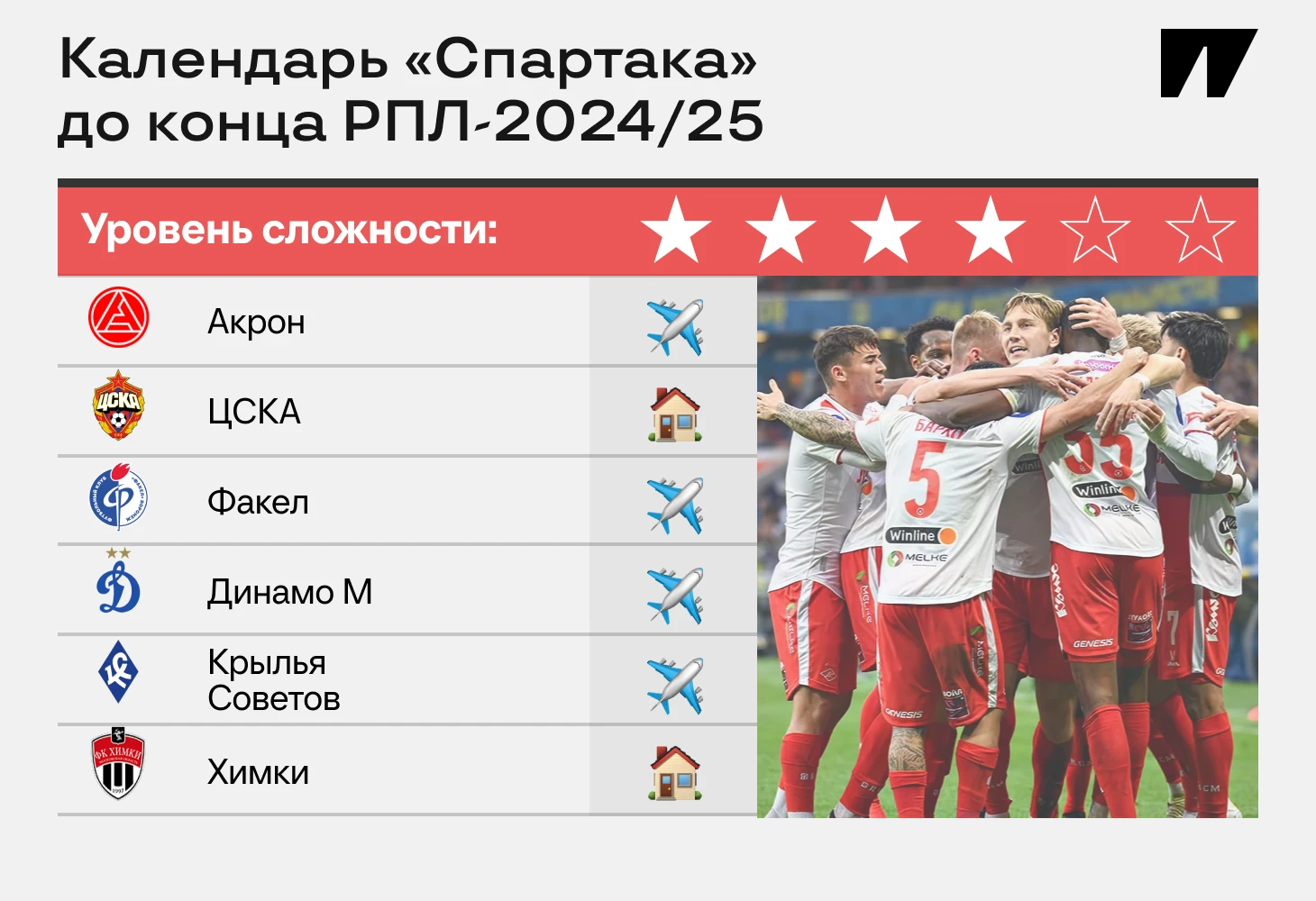 План «Спартака» сложнее «Зенита», но проще «Краснодара» и ЦСКА. «Спартаку» трудно против автобусов и прессингующих команд, но впереди удобный «Акрон», нестабильные «Крылья» и «Химки». Даже «Факел» сейчас не должен сильно напрягать.
