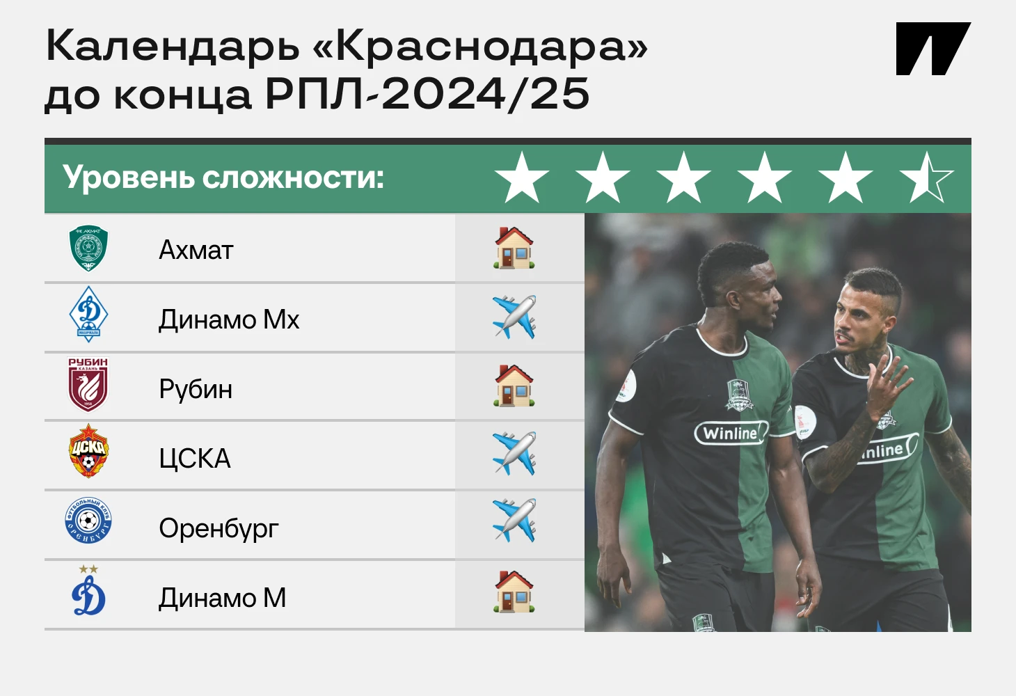 У «Краснодара» самый сложный календарь среди всех претендентов. ЦСКА и «Динамо» борются за топ-3. «Рубин» – самый неприятный середняк РПЛ, уже остановивший победную серию «Краснодара», хоть и без особых турнирных задач. Махачкала – дерзкая и прессингующая, надежность сзади обеспечивают дисциплинированный низкий блок и жесткость без мяча, а яркости впереди добавляют рывки Гамида Агаларова, индивидуальные действия Эгаша Касинтуры и Джавада, плюс есть подключения правого латераля Мохамеда Аззи.