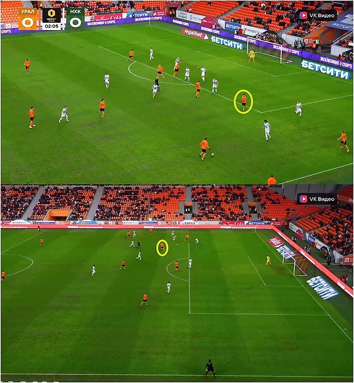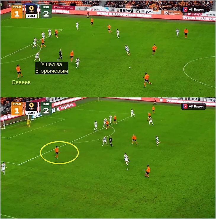 В первом тайме «Урал» играл в 3-5-2 и нагружал полуфланги: левый центральный защитник Итало уходил шире и либо отправлял в середину Бевеева, либо протаскивал сам. Егорычев выманивал в глубину правого центрального защитника Кахидзе, который регулярно упускал Андрея за спину после перевода на фланг, а опорники не успевали подхватить. На другом фланге было плюс-минус так же.