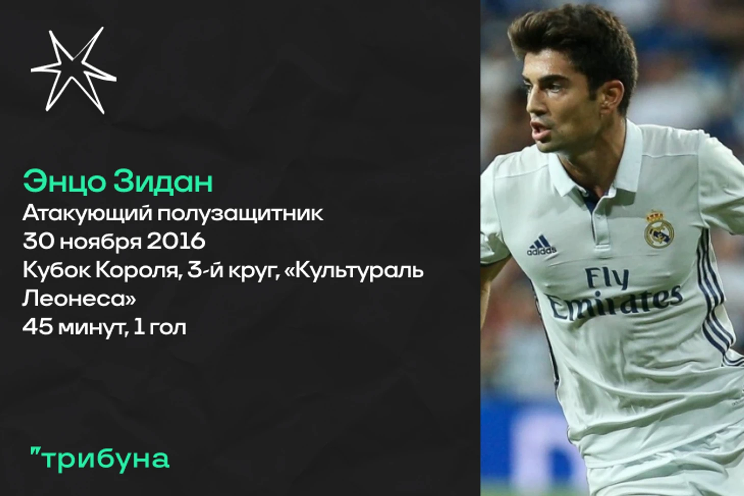 Винисиус уже был в подборке, теперь очередь дошла и до Зидана. Но если бразилец никакого отношения к нынешней звезде клуба не имеет, то Энцо -- сын великого Зинедина. Он прошел все возраста академии «сливочных», получив свой единственный шанс сыграть под руководством отца в матче Кубка с «Культураль Леонесой». Тогда полузащитник вышел на второй тайм вместо Иско. Впрочем, игра к тому моменту была уже сделана. На счету Энцо даже есть забитый гол — ассистировал ему великий Мариано Диас. Дальнейшая карьера у Зидана не получилась -- он не смог закрепиться ни в «Алавесе», ни в швейцарской «Лозанне», ни в португальском «Авише», ни во французском «Родезе». Были безуспешные попытки и в низших испанских лигах – тщетно. Энцо завершил карьеру осенью 2024 года. Сейчас ему тридцать лет.
