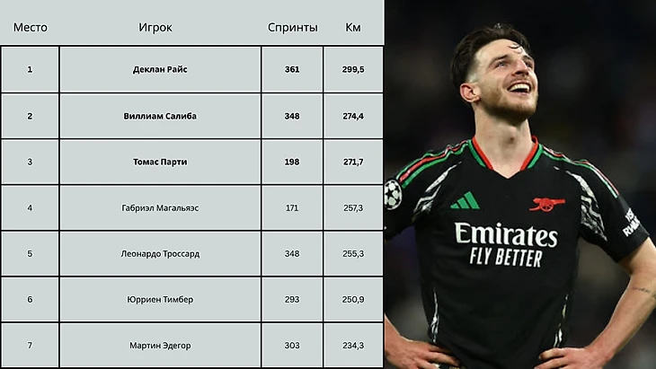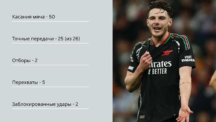 В ответном матче на «Сантьяго Бернабеу» Деклан Райс снова подтвердил своё лидерство в «Арсенале», хоть на этот раз забитых мячей от него мы не увидели. Но стало очевидным другое - тот факт, что именно этот парень тащит «канониров», выжигая центр поля и позволяя главному тренеру Микелю Артете постоянно повторять на пресс-конференциях свои излюбленные слова о доминировании. После вчерашнего матча Артета был более скромен, но отметил вклад Деклана в общий успех : «Райс был невероятен. Повел за собой команду и сделал эту игру».