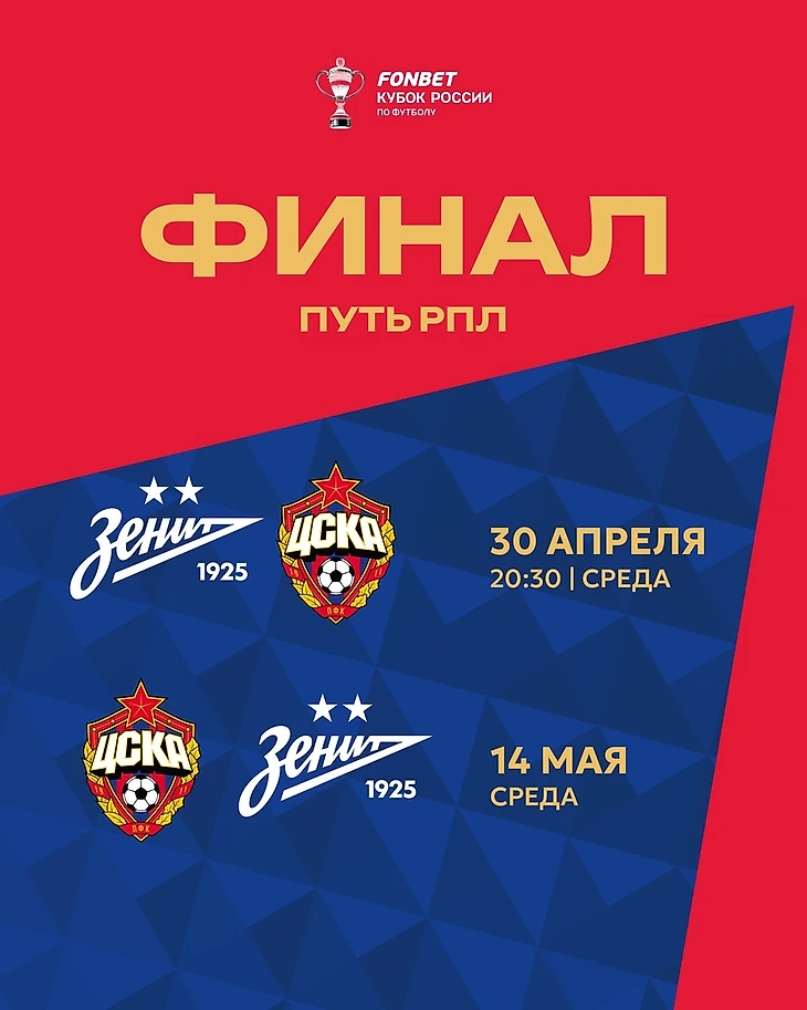 Первая встреча финала Пути РПЛ пройдет 30-го апреля в 20:30 в Санкт-Петербурге на «Газпром Арене»