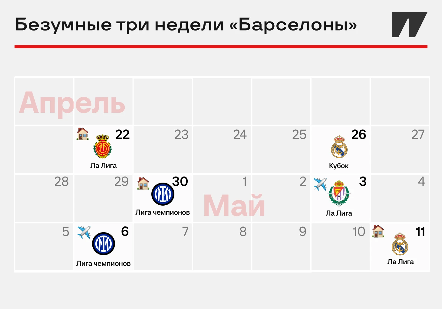 Два матча с «Интером», класико в финале Кубка Испании и потом – еще одна игра с «Реалом», важнейшая для чемпионской гонки. Прямо сейчас расклады выглядят так, но каждая встреча важна: одна потеря – и все.
