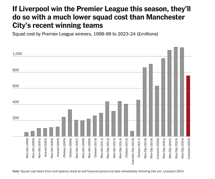 Если команда Слота действительно возьмёт титул, она станет самым «дешёвым» чемпионом с сезона 2019/20 — того самого, когда «Ливерпуль» впервые за 30 лет поднял трофей. Для сравнения: состав нынешнего чемпиона стоил на £350 млн (32%) дороже, чем претенденты с «Энфилда».
