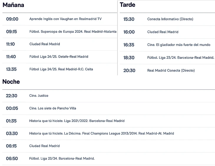 Есть регулярные форматы: Hoy Jugamos («Сегодня играем») – предматчевые обзоры, Ciudad Real Madrid (Городок «Реал Мадрид») – репортажи из тренировочного центра, Real Madrid Conecta («Реал Мадрид на связи») – ежедневные новости, Historia que tú hiciste («История, которую ты сотворил» – строчка из гимна) – с документальными фильмами о легендах и легендарными матчами, Campo de estrellas («Поле звезд») – сюжеты про известных игроков, Madridistas por el mundo («Мадридисты по всему миру») – истории о болельщиках, Historias con alma («Истории с душой») – о социальных проектах.