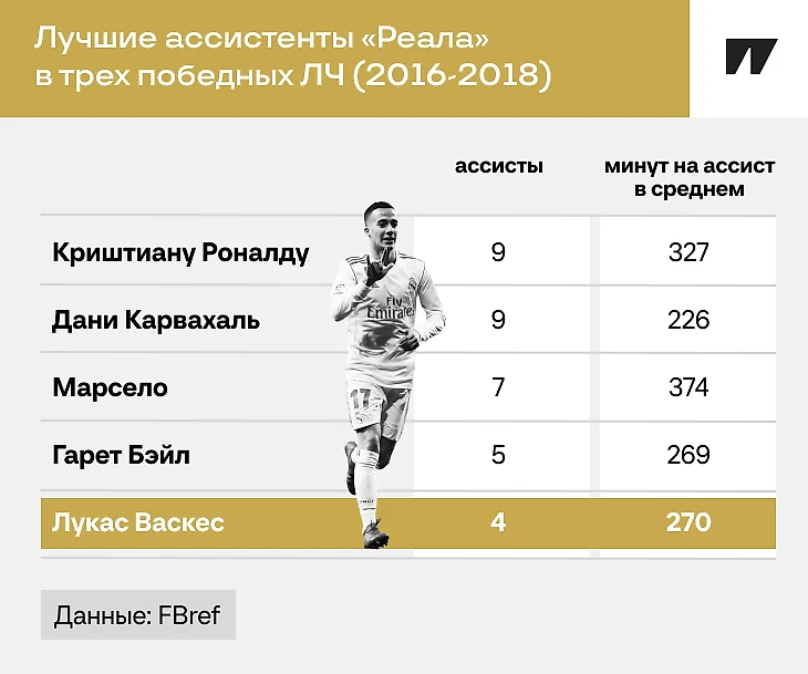«Мадрид» выиграл 11-й кубок ЛЧ, а Лукас стал одним из главных актеров второго плана. В следующих сезонах Зидан сделал Васкеса джокером: испанец играл постоянно, чередуя старт и выход на замену. В сезонах 2016/17 (50 матчей) и 2017/18 (53) он сделал 12+30. И стал одним из лучших ассистентов «Реала» в период (2015-2018) с тремя кубками ЛЧ подряд – 24 голевых.