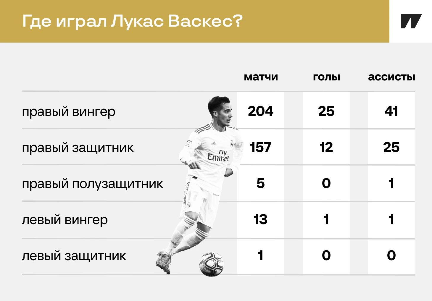 Cезон-2024/25 не зря считается последним для Васкеса в Мадриде: он часто ошибается, уступает в единоборствах и проводит много слабых игр. Оправдать его может травма Карвахаля, которая в октябре оставила Лукаса безальтернативным вариантом на весь сезон.