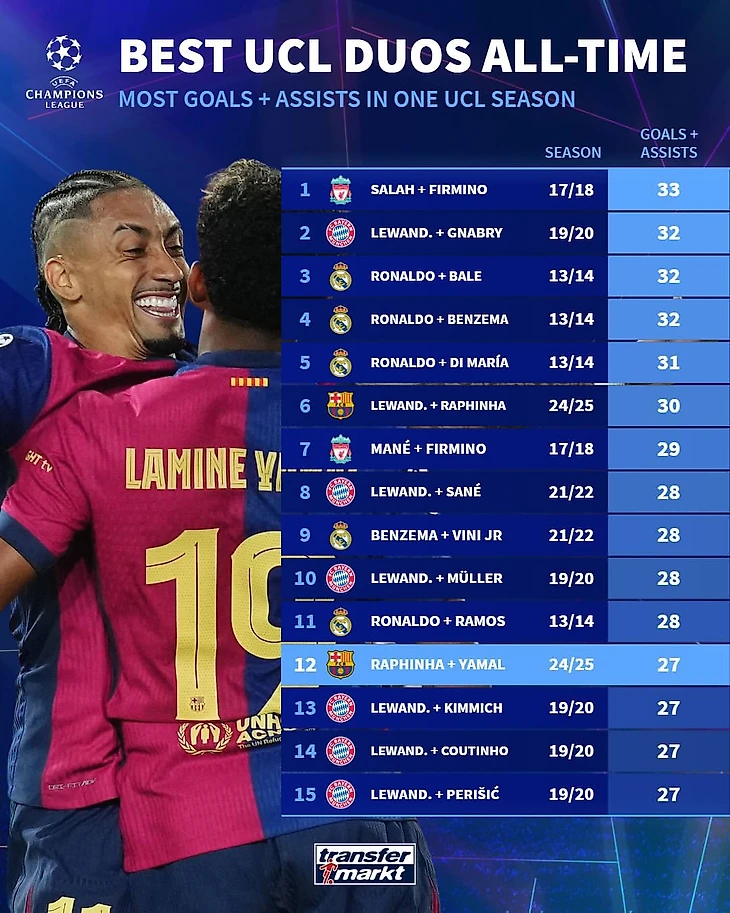 Из текущего розыгрыша турнира в рейтинг попали результаты двух связок «Барселоны»: Роберта Левандовского с Рафиньей (30 на двоих по «гол+пас») и Рафиньи с Ламином Ямалем (27 на двоих по «гол+пас»).