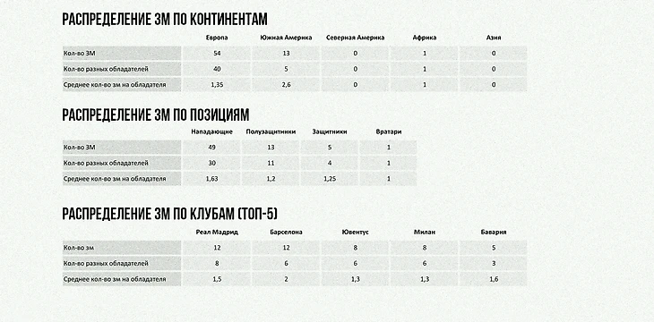 Золотой мяч — ежегодная награда, вручаемая лучшему игроку календарного года, многие считают эту награду самым главным поводом для обсуждения, похлеще финала ЛЧ или ЧМ, а ещё больше людей считают, что награда не всегда объективна и им есть, что оспаривать. Но мы сегодня не об этом, нас интересует непосредственно количество ЗМ на той или иной позиции, континенте и клубе.