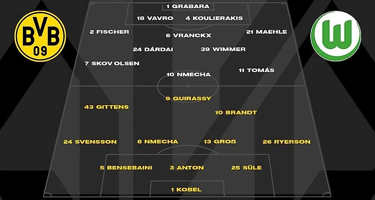 Завершала программу субботы матч в Дортмунде, где на стадионе «Сигнал Идуна Парк» местная «Боруссия» принимала «Вольфсбург». Главный тренер гостей Ральф Хазенхюттль выставил на поле достаточно боевой состав: Камиль Грабара, Константинос Кулиеракис, Денис Вавро, Килиан Фишер, Йоаким Меле, Астер Вранкс, Андреас Сков Ольсен, Патрик Виммер, Бенце Дардаи, Тиагу Томаш и Лукас Нмеча. При этом, «волки» играли по схеме 4-3-3.
