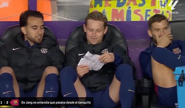 Френки де Йонг, начавший матч на скамейке, не удержался — поднял несколько купюр и с интересом их рассмотрел. А потом даже припрятал парочку в карман.