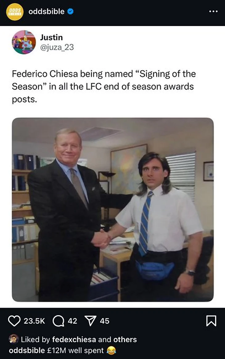 Один из фанатских аккаунтов решил пошутить на эту тему и сделал мем с героями популярного сериала «Офис» со следующей подписью: «При подведении итогов во всех постах о награждении игроков «Ливерпуля» Федерико Кьезу назвали «Трансфером года».