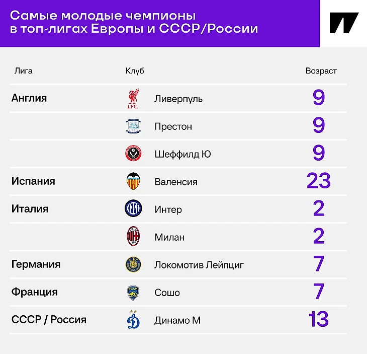 А вот как в топ-5 лигах и чемпионатах СССР/России располагаются самые молодые чемпионы.