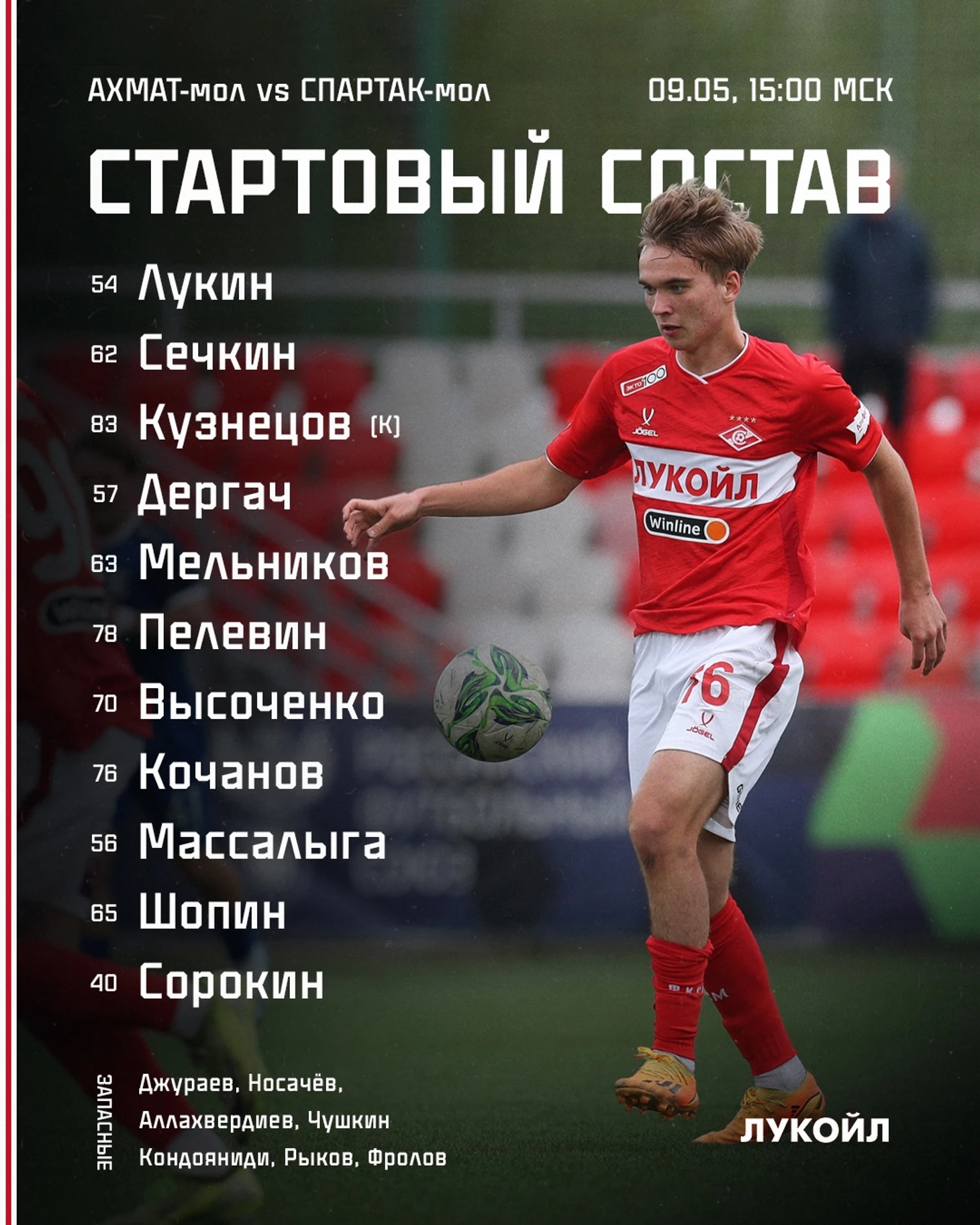 Состав. Сегодня игроки «Спартака-2» задействованы не были, и состав молодежки принял более привычный для этого сезона вид. Отметим первый выход в старте Дмитрия Шопина, а также вообще первое появление на поле Артёма Носачёва, который зимой перенес операцию и восстанавливался несколько месяцев.