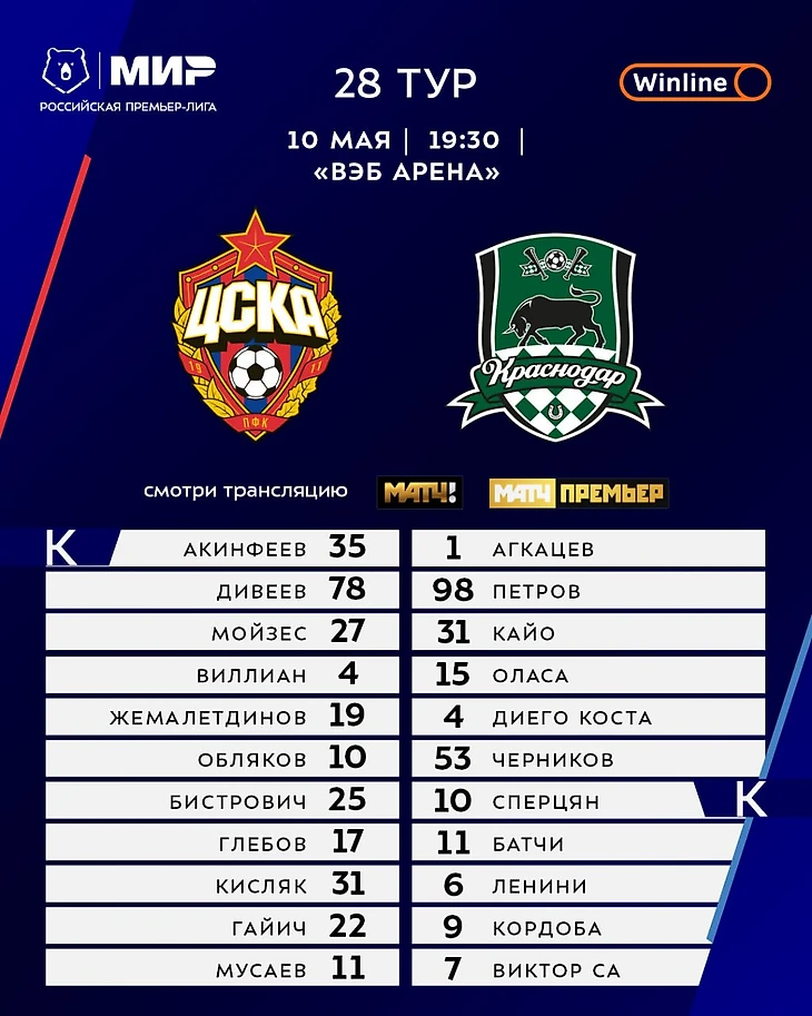 «Краснодар» вышел практически в оптимальном составе, отсутствовал только дисквалифицированный Тормена. ЦСКА, в свою очередь, сделал ротацию перед кубковым матчем с «Зенитом». Вместо Пьянича вышел Жемалетдинов, а вместо пары Койта - Гуарирапа появилась связка Мусаев - Глебов. Также вместо дисквалифицированного Файзулаева на поле вышел Бистрович.