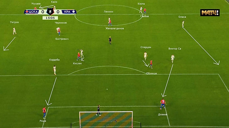 Несмотря на правильные действия, «Краснодар» не создал опасных моментов. Единственный заметный эпизод - удар Черникова, который Акинфеев отразил ногой. Это всё, что можно выделить из первого тайма.