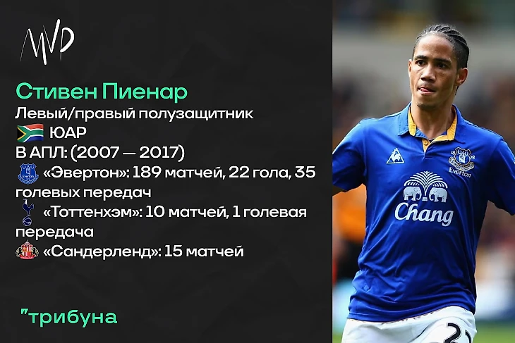 Чуть-чуть поговорив об игроке непримечательном, переходим к футболисту очень яркому. Стивен Пиенар, начинавший карьеру в «Аяксе» из Кейптауна, после чего перебравшийся в «Аякс» же, но уже из Амстердама. Транзитом через дортмундскую «Боруссию» южноафриканец перебрался в «Эвертон» в 2007 году, став, по итогу, одним из символов клуба на ближайшие восемь лет. Надо уточнить, что «ириски» времен первого пришествия в коллектив Дэвида Мойеса еще не были тем унылым середняком, регулярно рискующим угодить в борьбу за выживание, как сейчас. Та команда претендовала на Еврокубки каждый сезон, частенько заглядывая во второй по значимости турнир.