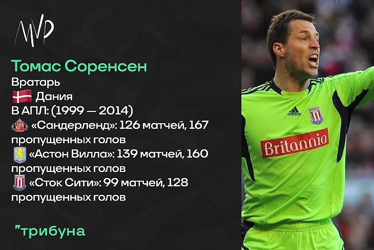 Будет правильно в каждый выпуск подобного формата добавлять минимум одного вратаря. И если в прошлый раз таковым оказался Роберт Грин, то сегодня я предложу вам вспомнить датчанина Томаса Соренсена. Набор английских клубов в его карьере весьма типичен для этой части, кстати. Приехал в АПЛ он в далеком 1999 году, на несколько лет связав себя с «Сандерлендом». Но об этом, честно признаться, я знаю только благодаря доступности статистики выступлений. А вот период игры за бирмингемскую «Астон Виллу» уже куда ближе к нашему времени. С 2003 по 2007 годы датчанин был номером один в команде, а затем уступил место в воротах Скотту Карсону и просидел целый сезон без игровой практики.