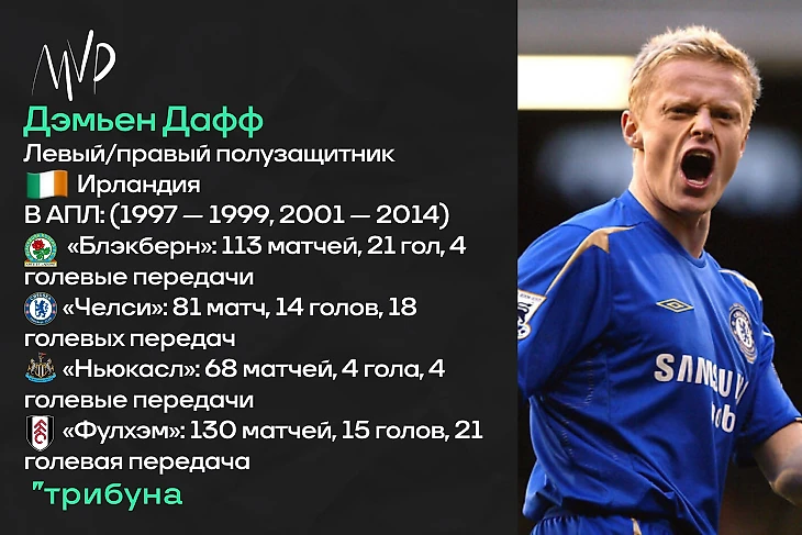 Почему именно Дафф попал в эту подборку? Для меня он является одним из тех, кто ознаменует собой тот самый английский футбол, который я лицезрел, будучи ребенком. Не особо техничный, не слишком быстрый, но очень работоспособный и крепкий фланговый полузащитник. Не обладая большим функционалом на поле, ирландец два сезона был в основе топового «Челси» Жозе Моуриньо. Это говорит о многом. Дэмьен, во времена игры за «Челси», еще и всегда заправлял футболку в шорты, что добавляло его образу некой аутентичности.